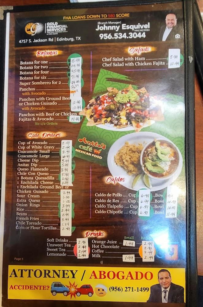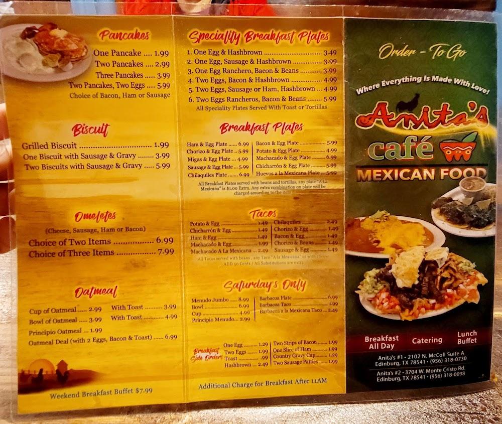 Welcome to Anita's Cafe, your go-to destination in Edinburg for delicious Mexican cuisine and a delightful breakfast experience. Located at 2102 N McColl Rd, we offer a vibrant atmosphere where you can savor local specialties, from hearty breakfasts to satisfying dinners. Enjoy our excellent coffee and an extensive selection of teas, perfect for casual gatherings or solo dining. With amenities that include takeout, delivery, and wheelchair accessibility, we strive to make every visit enjoyable. Join us for brunch, lunch, or dinner and take advantage of our happy hour specials—Anita's Cafe is where good food and great company come together!